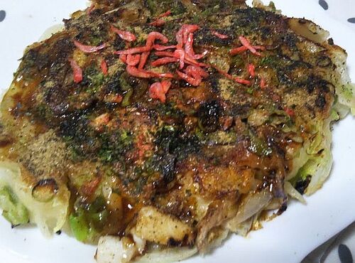 【半世紀前の京都お好み焼き店風(笑)】 鉄板付きのテーブルに座るが、写真のように店の人が焼いてくれるわけではない。取っ手付きのアルミカップに、メリケン粉を固めに練った生地を入れ、その上にキャベツなどのカット野菜、その上にほんの少しの豚やイカと…