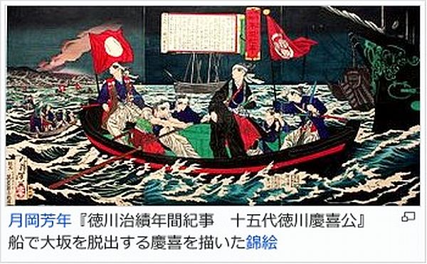 しかし、翌慶応4年(1868年)に薩摩藩の挑発に乗った慶喜は、京都に向け進軍の命令を出し、薩摩藩兵らとの武力衝突に至る(鳥羽・伏見の戦)。勃発した鳥羽・伏見の戦いにおいて旧幕府軍が形勢不利になったと見るや、まだ兵力を十分に保持しているにも関わらず、少数の近辺者とともに「謎の退却」を為し、幕府軍艦開陽丸で江戸に帰ってしまう。